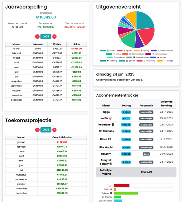 Voeg je inkomsten en uitgaven toe, vink af wat al betaald is en zie wat je nog kunt verwachten.